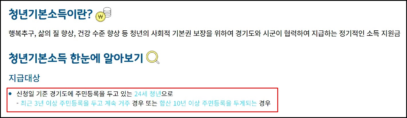 - 경기도에 거주한 지 3년 이상이거나 합산 10년 이상 거주한 만 24세 청년
