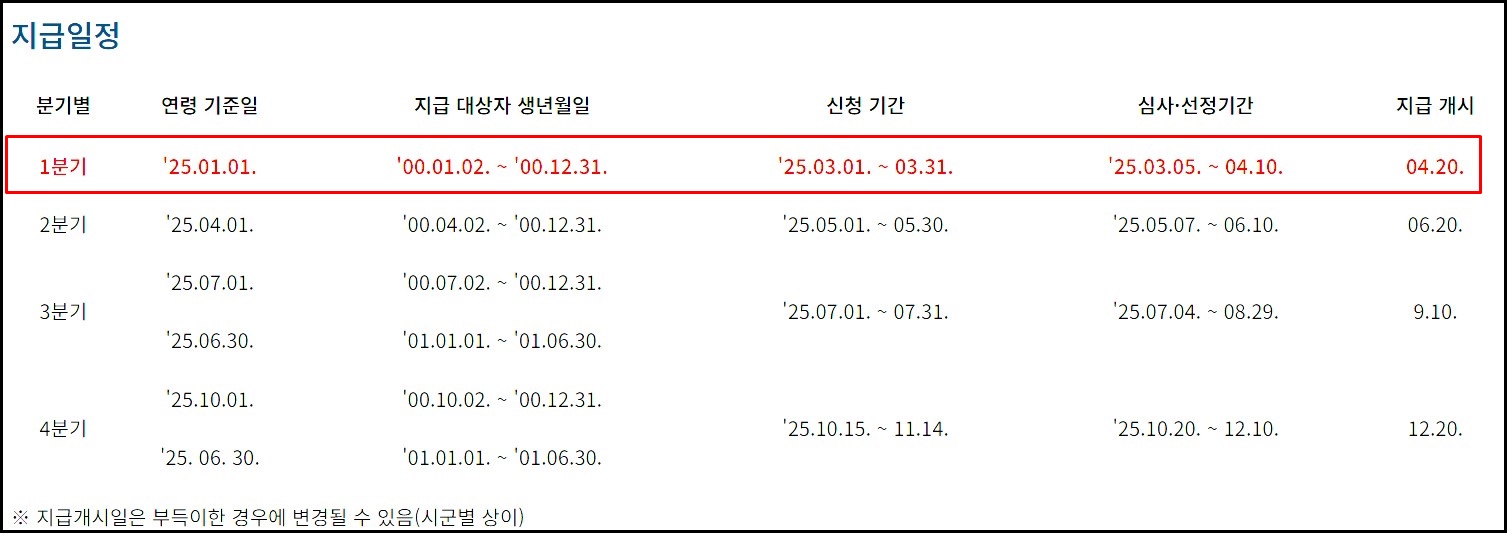 경기도 청년기본소득은 연간 총 100만 원이 지급되며, 분기별로 25만 원씩 지역화폐 형태로 지급됩니다. 지급 일정은 아래와 같습니다.