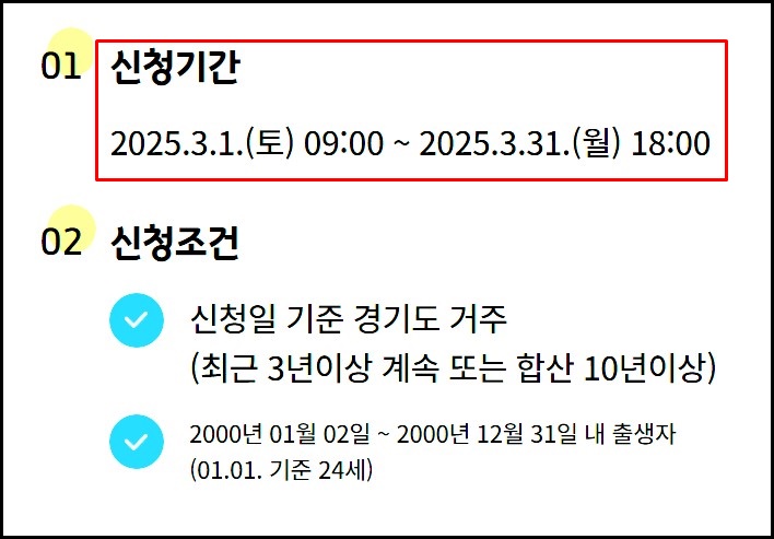 - 경기도 청년기본소득 1분기 신청기간: 2025년 03월1일 ~ 2025년 03월31일