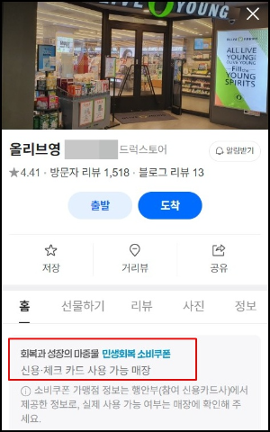 올리브영 가맹점 검색후 본인이 가고자 하는 가맹점을 클릭하면 민생회복 소비쿠폰 매장이라고 나와있습니다.