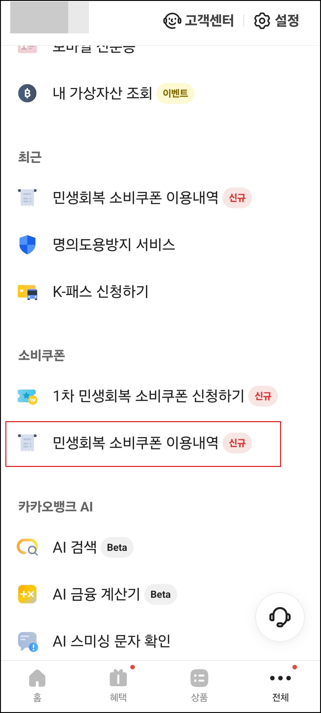 카카오뱅크 앱 - 전체 - 소비쿠폰- 민생회복 소비쿠폰 이용내역 - 소비쿠폰 사용 가능 가맹점 알아보기 클릭