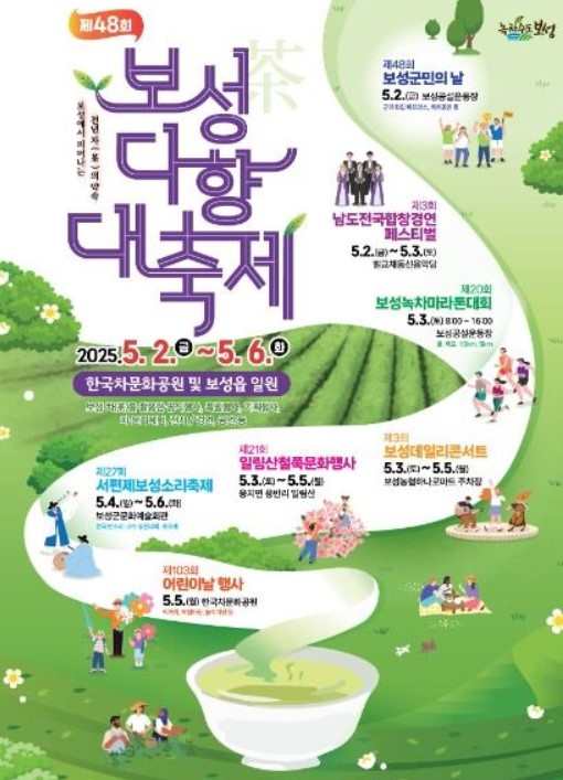 | 보성다향대축제 | 2025.05.02 ~ 05.06 | 보성군 한국차문화공원, 보성차밭 일원 | 차 시음회, 다례체험, 문화공연, 녹차 요리 체험 | 061-850-5221 |