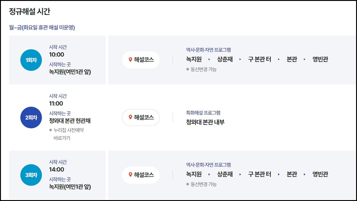 - 2회차: 11:00 (시작 장소: 청와대 본관 현관채) - 사전예약 필요
