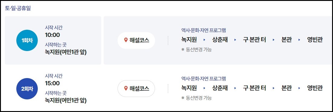 - 2회차: 15:00 (시작 장소: 녹지원)