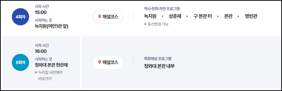 - 5회차: 16:00 (시작 장소: 청와대 본관 현관채) - 사전예약 필요