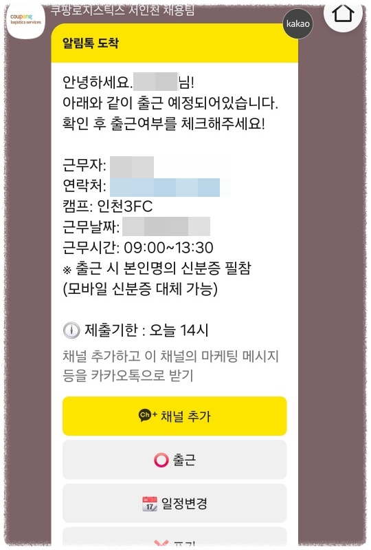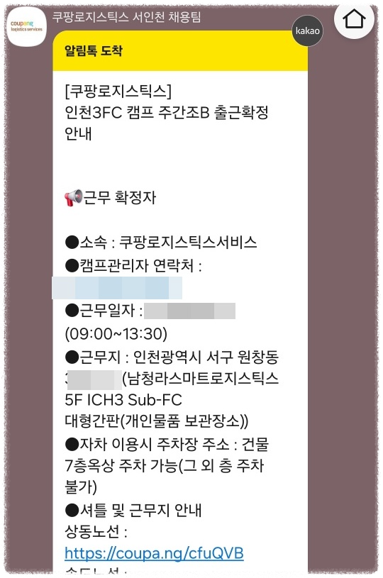 근무가 확정되면 쿠팡 채용팀에서 출근 여부 연락이 온 후 채용이 되면 근무 확정 문자가 옵니다.