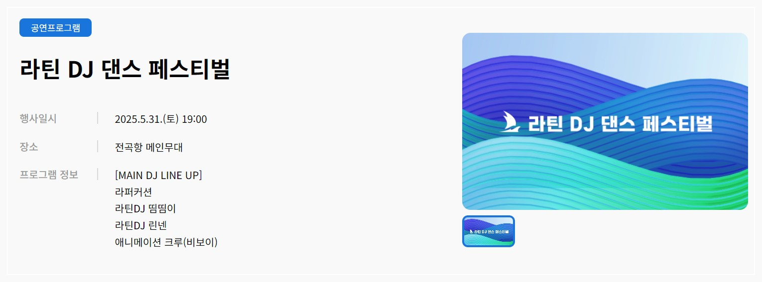 - 라틴 뮤직 댄스 페스티벌: 라틴DJ, 라틴댄스, 살사 공연팀, 카포에라 공연팀이 함께하는 댄스 페스티벌