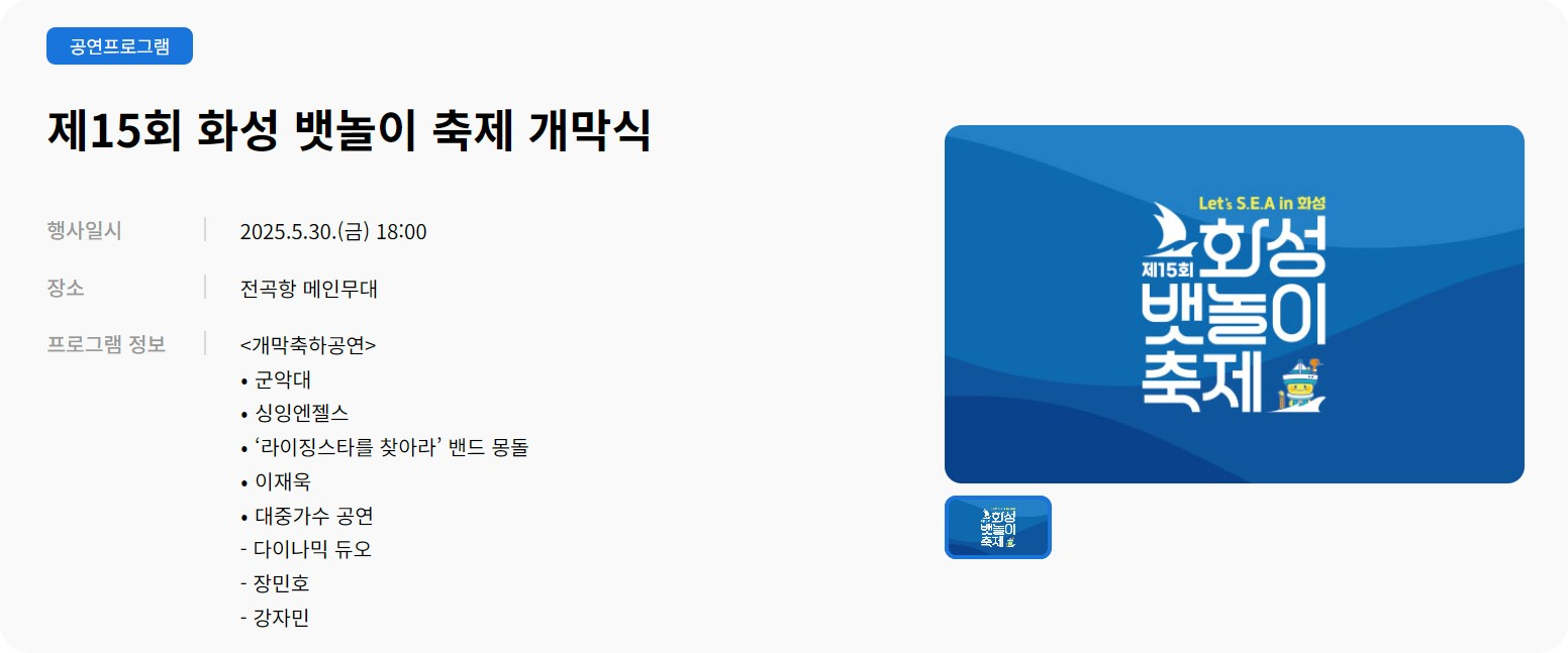 안녕하세요, 여러분! 오늘은 수도권 최대 해양 축제인 '2025 화성 뱃놀이 축제'에 대해 자세히 소개해드리려고 합니다. 푸른 바다와 함께하는 특별한 3일간의 축제! 출연 가수, 먹거리, 주차 정보 등 알찬 정보로 가득 준비했으니 함께 살펴볼까요?